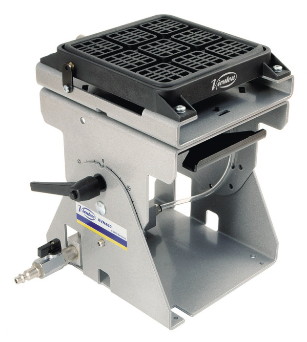 右写真のように吸着固定ユニットSVN250をベースの裏側に取り付けますと、ネジやクランプを使わずに作業台に吸着固定できるうえ、間単に場所を移動させたり、本体を回すことができます。 |