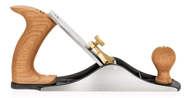 スクラブプレーンは円弧状の刃でスピーディに粗削りする、削り量の多いカンナです。反った板の片面をすばやく平らにし、その面を基準にして自動カンナにかければ材は平らになります。このほかにも独特の波状の削り面を生かした作品作りなどにも使われています。刃の出し量調節は金槌で行います。刃口は荒削り用にはじめから広く、刃口調節機能はありません。