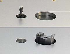 大小ビット穴を使い分けた状態です。ビット穴の穴径は18mmと36mmです。従来のインサートリングによる穴径調節ではないため、段差がなく材が引っかかることがありません。