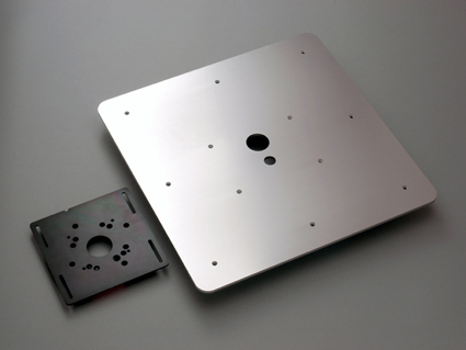 この天板があればトリマーテーブルの自作は簡単です。しかもご自分の使用目的に合ったトリマーテーブルの製作が可能になります。 MIRAIトリマー天板には大小2つのビット穴があり、ビットのサイズにより、トリマーを移動して使い分けます。